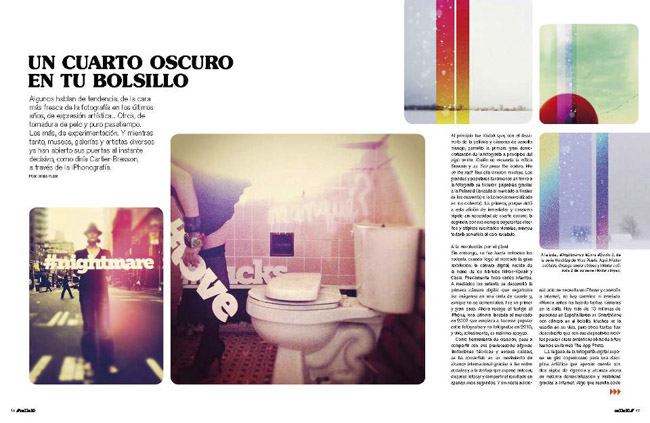 Calle 20, printed culture magazine distributed on main Spanish cities, includes in #67 edition of April 2012, an article about iPhoneography. Named “A Darkroom in your Pocket” and written by Inma Flor features some iPhone photographers including Jordi V. Pou.