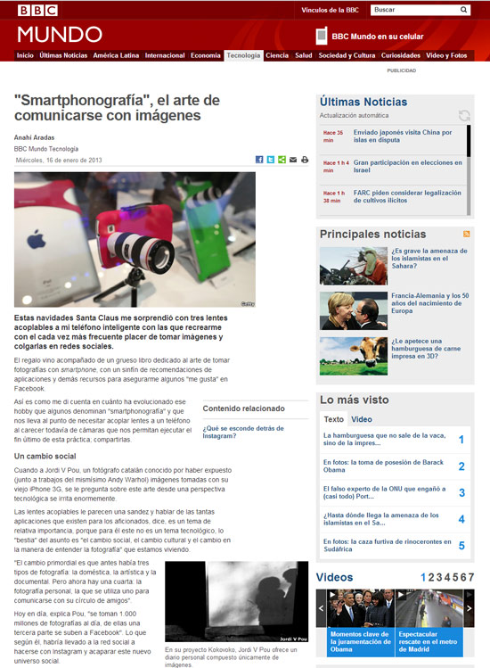 BBC Mundo, the BBC website in Spanish, just published an article by Anahí Aradas named “Smartphonography, the art of communicating with pictures“. It’s an article about how smartphone photography is being used actually. Includes part of an interview with Jordi V. Pou and one of his Kokovoko project Images.