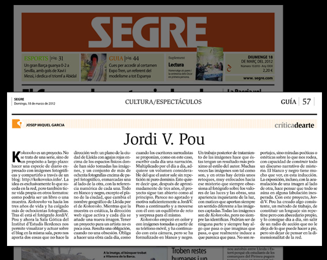 Segre newspaper from Lleida publishes today an article by art critic Josep Miquel Garcia about Jordi V. Pou on ocassion of his Kokovoko.info exhibition actually showing in Lleida.