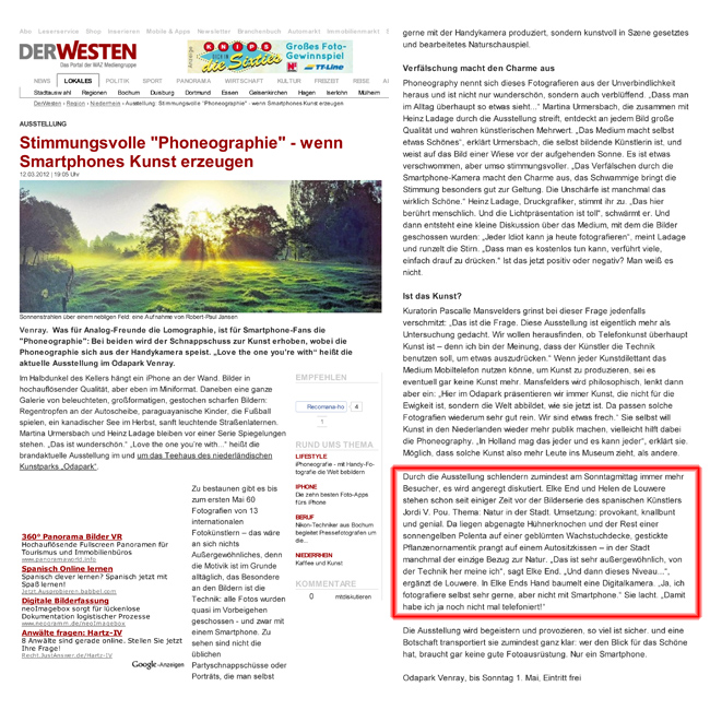 German newspaper “DerWesten” published an article yesterday about Odapark “Love the one you’re with” exhibition in Venray, The Netherlands. Jordi V. Pou did a new series named Perfect Nature for this exhibition.